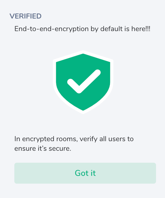 Finally, we no longer nag and block messages even when an unverified session appears in a conversation - the user’s shield going red is your cue to warn you that badness may be happening.