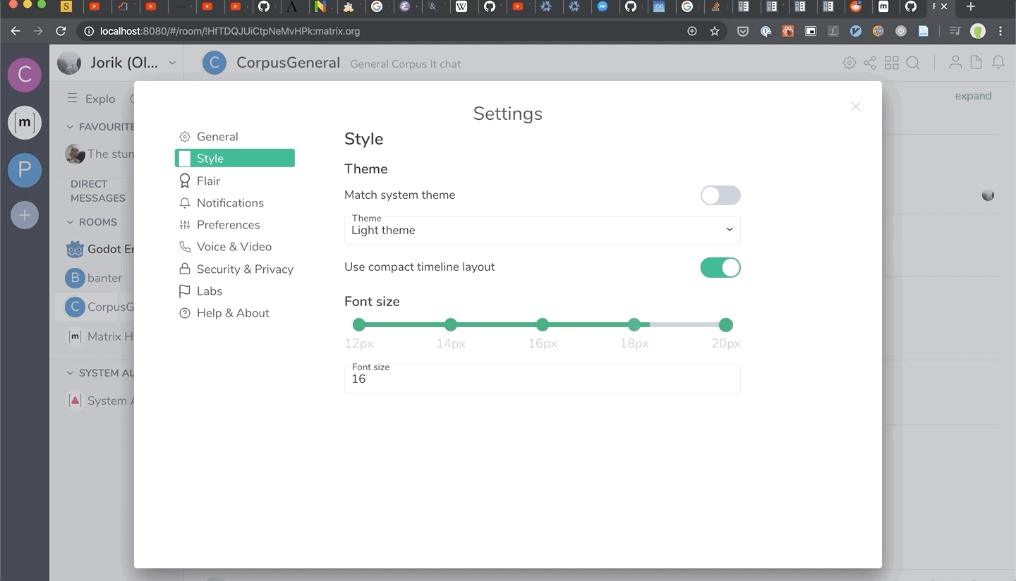 Also, it’s not merged yet, but we have support for dynamic font sizing in Riot Web on the horizon - expect to see it in a later Riot 1.6.x release. Huge thanks to Jorik for putting it together… and preparing the timeline CSS for more interesting layouts in future!